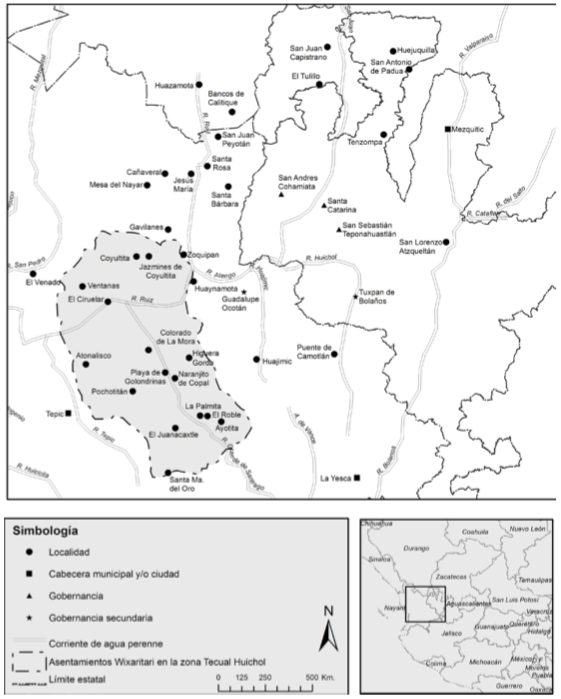 Este territorio sagrado es compartido con los huicholes que viven en rancherías establecidas a lo largo del río Santiago, quienes aprovecharon sus afinidades culturales y lingüísticas con los tecuales (Arias y Saavedra, 1986, 1990; Téllez, 2006a, 2011a, 2011d; Weigand, 1992). Los asentamientos fueron formados desde mediados del siglo XIX por huicholes expulsados de sus comunidades por la violencia generada por el movimiento lozadista, la Revolución y la Cristiada. Desde los años noventa, esta zona ha sido afectada por la construcción de obras hidráulicas de gran envergadura, como las presas de Aguamilpa y El Cajón (ver imagen 2).